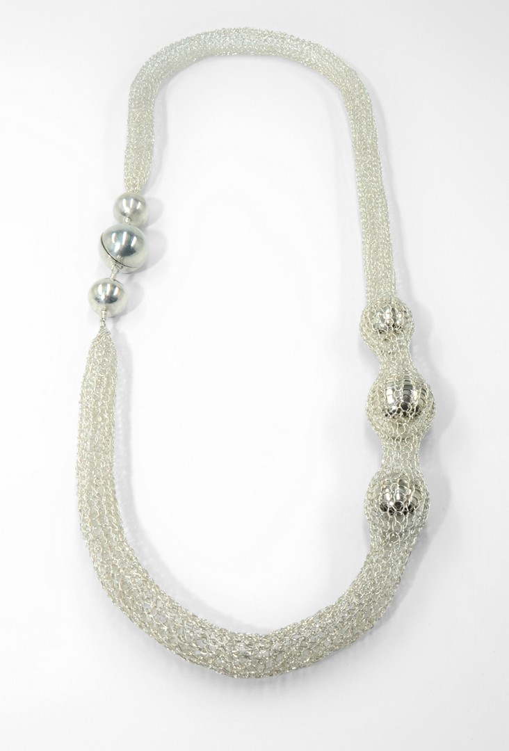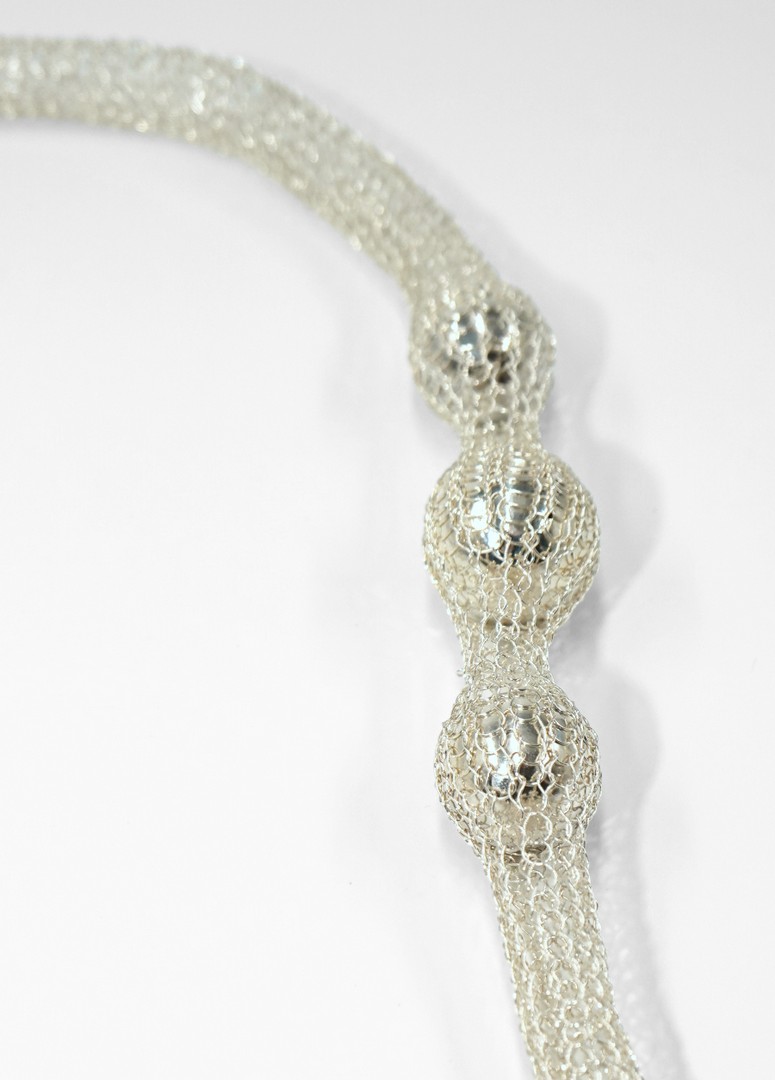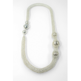 Zilveren halsketting, gehaakt van dun zilverdraad met zilveren bolletjes. Met aparte sluiting.